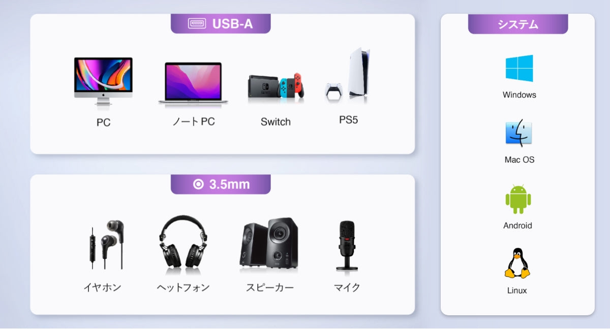 【幅広い互換性】Windows、Mac OS、PS4、PS5、Linux、Chromebookなど、USB-Aポートを備えたさまざまなデバイスで利用可能。ドライバのインストールは不要で、差し込むだけですぐに使用できます。