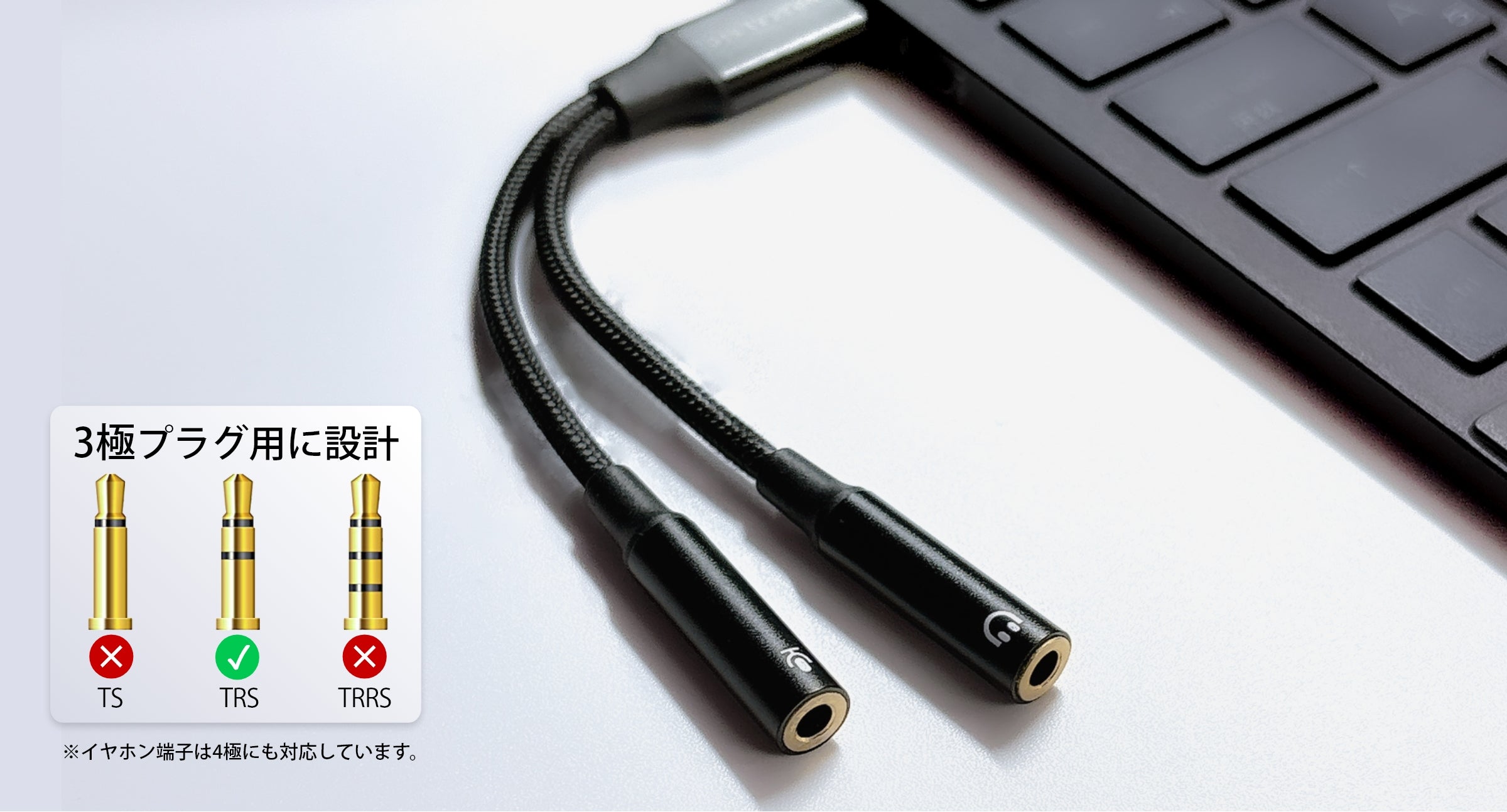 【USBオーディオ変換アダプター】3.5mmプラグのヘッドホン・スピーカーの音声出力やマイク入力を、USBポート経由で使用できるオーディオ変換アダプターです。マイク入力端子は3極(φ3.5mm)に対応し、イヤホン出力端子は3極・4極(φ3.5mm)の両方に対応。 ※マイク入力端子は4極(φ3.5mm)非対応のため、ご注意ください。 ※本製品はUSBポートからオーディオ信号への変換を行うものであり、ノイズ軽減を目的とする場合は別途ノイズフィルターをご用意ください。