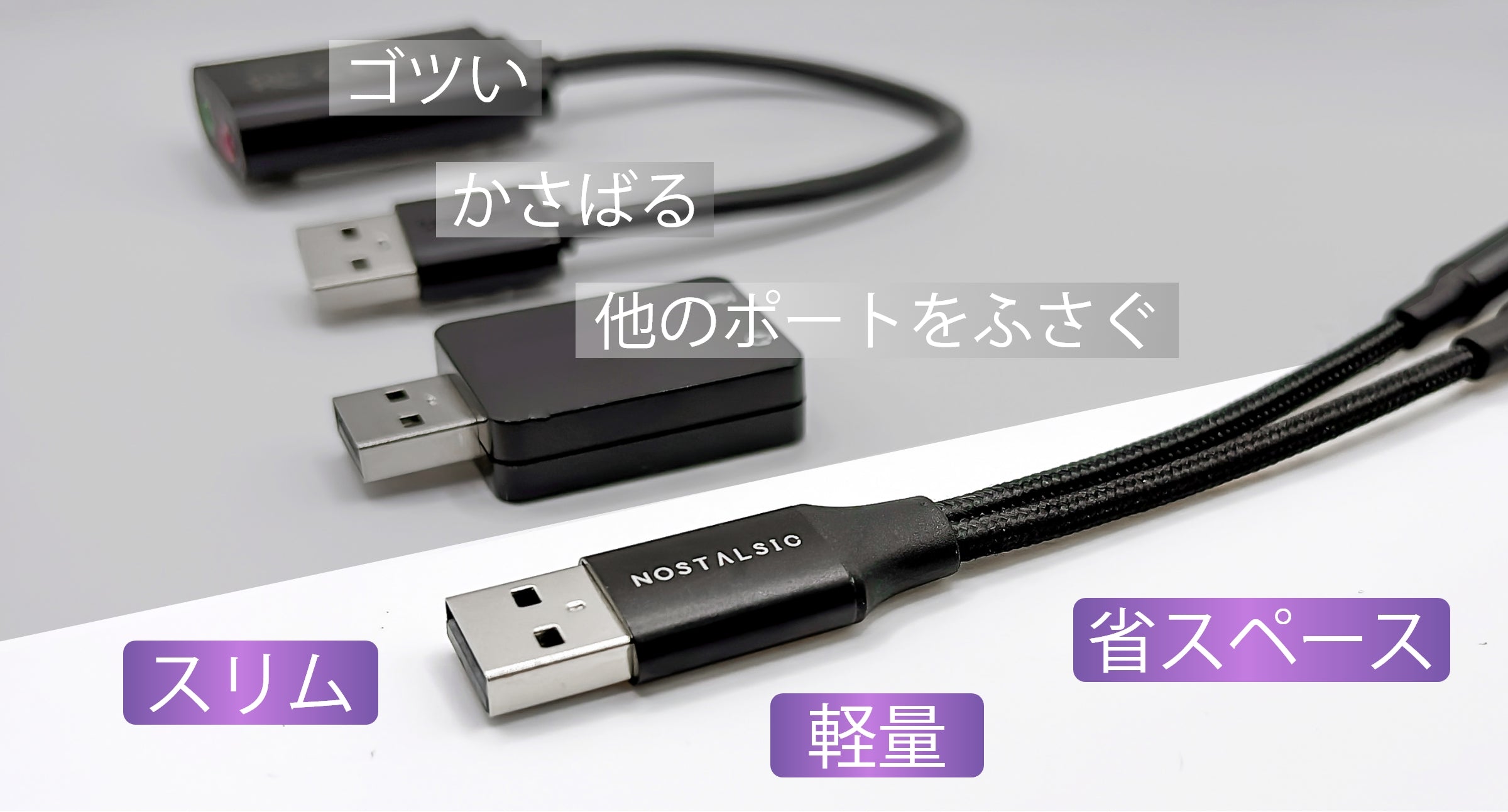 【スリム&コンパクト設計】一般的なUSBオーディオ変換アダプタは横幅のあるボックス型が多いですが、本製品はスリムなケーブル一体型デザインを採用。接続時に邪魔にならず、持ち運びやすいのが特長です。