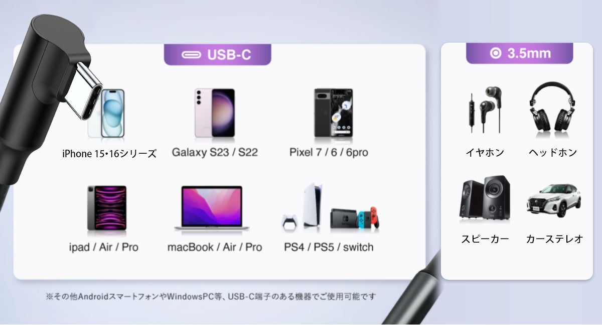 【幅広い互換性】DAC内蔵により、様々なType-Cポート搭載デバイスで使用可能。iPhone(Type-C搭載モデル)、iPad Pro、MacBook、Galaxy、Huawei、Google Pixelのほか、PS4・PS5にも対応。macOS・iOS・Androidなどの各種システムに対応し、幅広い互換性を実現しました。