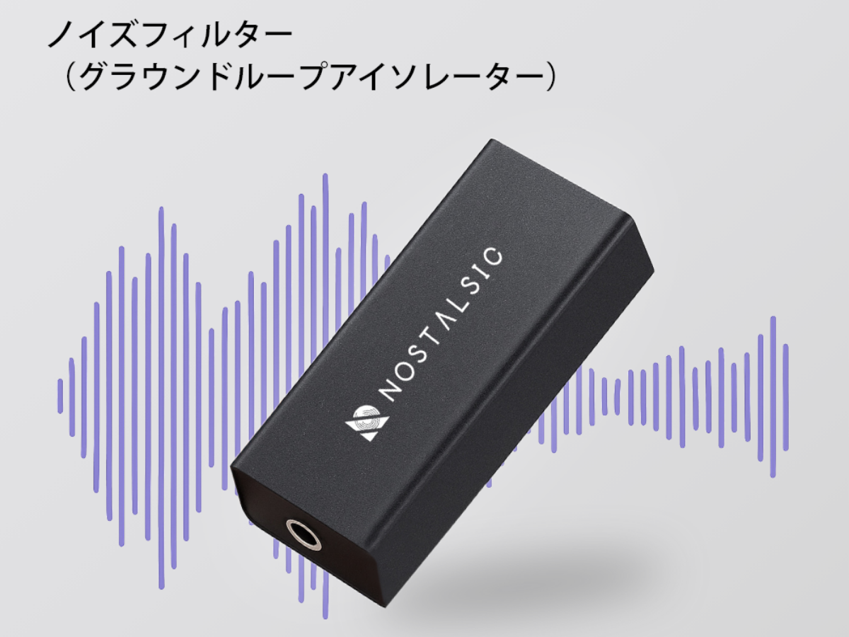 BluetoothレシーバーやPCとスピーカーを接続した際に発生するグランドループノイズを、中継するだけでカットできるノイズフィルターです。