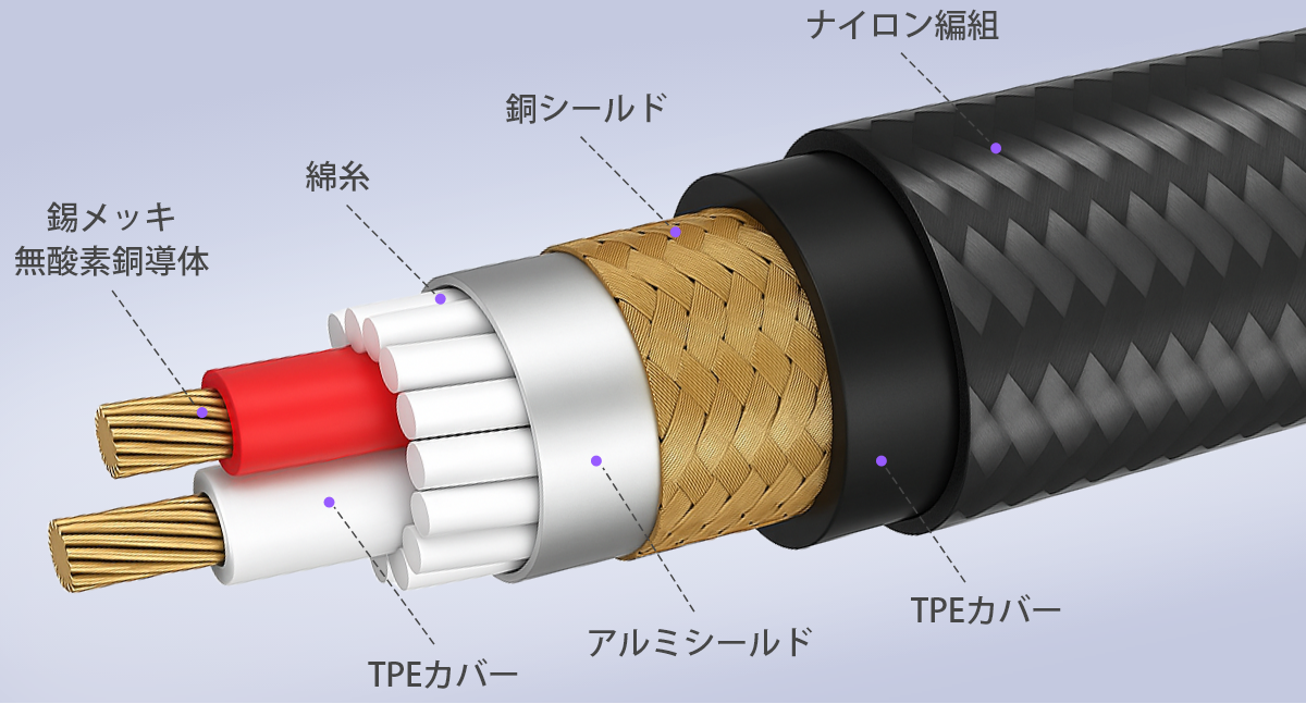さらに、アルミと銅による多層シールド構造を組み合わせることで、外部からのノイズ干渉を低減し、安定した信号伝送を実現。音声信号の乱れや歪みを抑え、快適なリスニング・モニタリング環境を支えます。