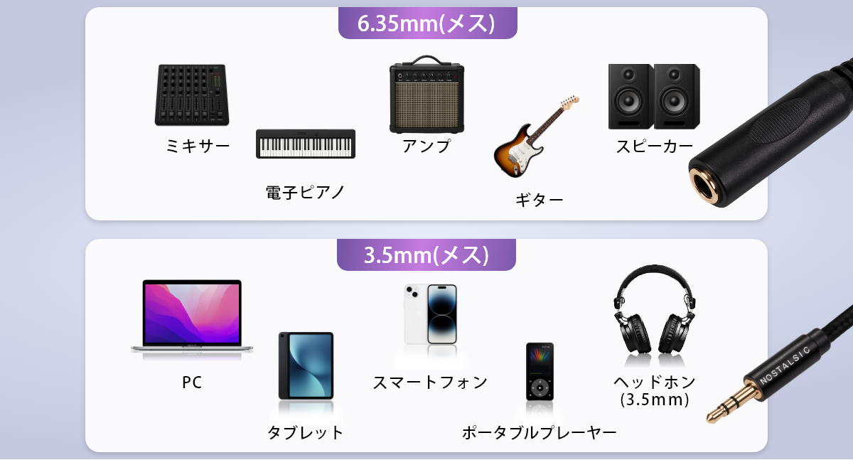 【1】日常から音楽制作まで使える汎用変換ケーブルNOSTALSICの6.35mmメス→3.5mmオス ステレオ変換ケーブルは、アンプ、電子ピアノ、ギター機器などの6.35mm標準ジャックと、ヘッドホンやスマートフォンなどの3.5mmミニプラグ機器をつなぐための汎用モデルです。家庭用・業務用どちらにも対応し、1本持っておくと幅広いシーンで活躍します。【2】錫メッキ無酸素銅 × 多重シールド構造導体には、信頼性の高い錫メッキ処理を施した無酸素銅(OFC)を採用。さらに、アルミと銅による多層シールド構造を組み合わせることで、外部からのノイズ干渉を低減し、安定した信号伝送を実現。音声信号の乱れや歪みを抑え、快適なリスニング・モニタリング環境を支えます。【3】断線に強いナイロン編みケーブル外装には耐久性に優れたナイロン編みケーブルを使用。柔軟性があり、頻繁な折り曲げや取り回しにも強く、断線や絡まりを防ぎます。一般的なPVCケーブルよりも長持ちし、持ち運びにも便利です。【4】扱いやすさを考慮した設計3.5mmおよび6.35mm端子には、滑り止め加工付きの軽量樹脂外装を採用。金属製プラグに比べて手になじみやすく、抜き差し時も滑りにくいため、より快適で安定した操作感を提供します。【5】日本ブランドによる安心品質NOSTALSICは日本国内で企画・品質監修を行うオーディオアクセサリーブランドです。コストを抑えつつも、日常使用に必要な耐久性・安定性・信頼感を備えた設計を徹底。初めての方にも安心してお使いいただけるエントリーモデルです。※モニターの発色具合によって、実際のものと色合いが異なる場合がございます。
