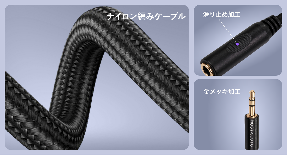 ナイロン編みケーブルだから柔軟性があり、頻繁な折り曲げや取り回しにも強く、断線や絡まりを防ぎます。